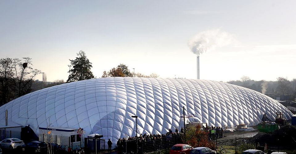 生产和安装过程中,无噪音、无粉尘、无建筑废料、无碳排放、无工地。 不用一砖一瓦,不使用钢筋水泥,只用绿色膜材和空气作为建筑材料。